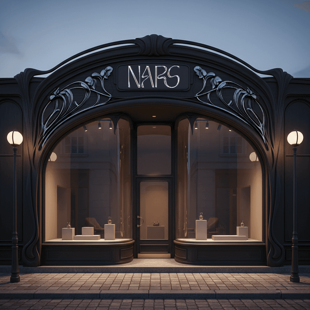Rebrand NARS by evolving its legacy of bold artistry into a more intimate, luxurious femme fatale identity. Shift from minimal rebellion to seductive opulence with a mysterious edge.